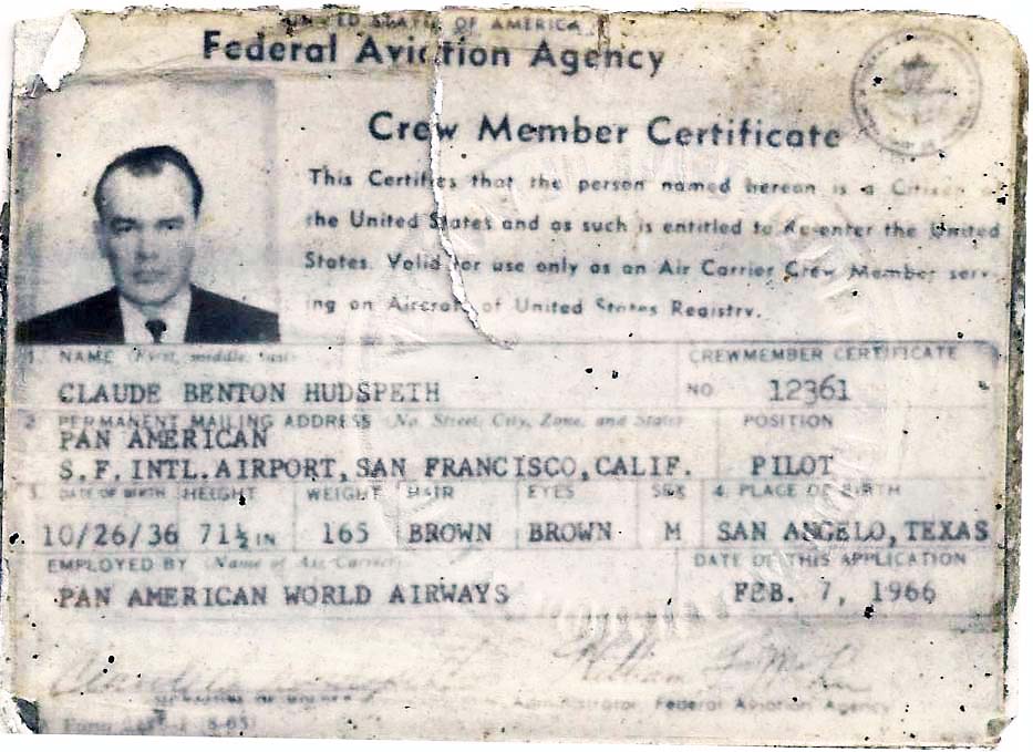 While flying for Pacific, I ran into a former Slick pilot and learned Pan American was hiring in San Francisco. Thinking that would be about as good a job as a pilot could ever hope for, I interviewed, took a battery of tests all day long, and was hired. I started with Pan American on January31, 1966. Starting pay was $500. I was 29 years old.