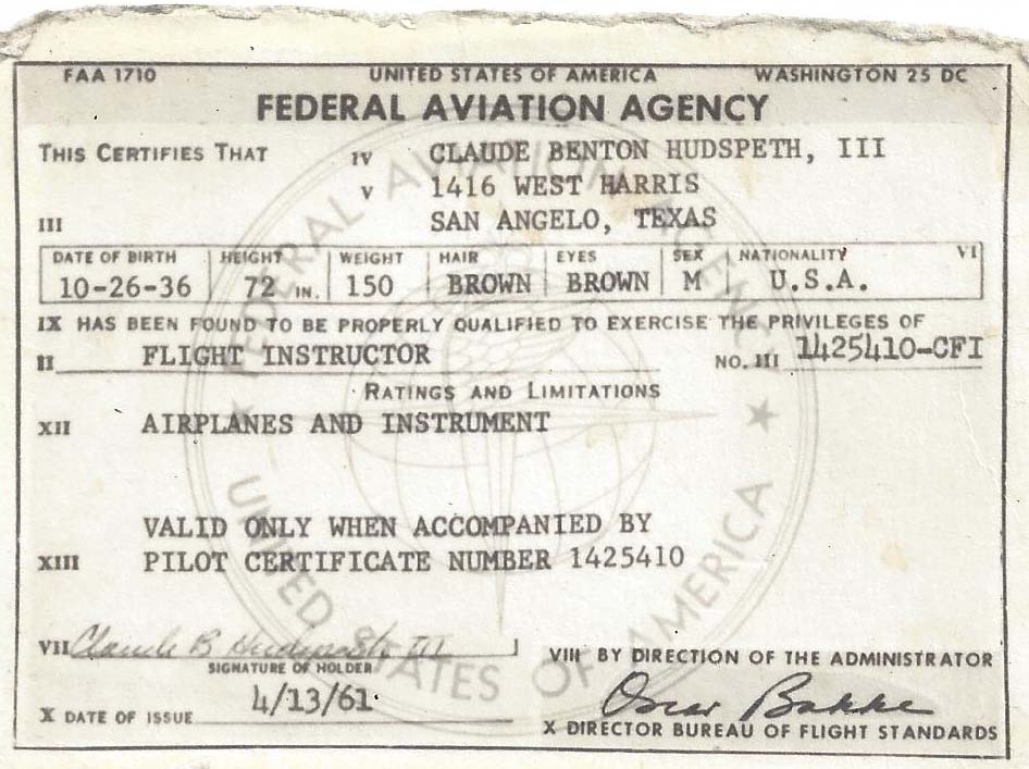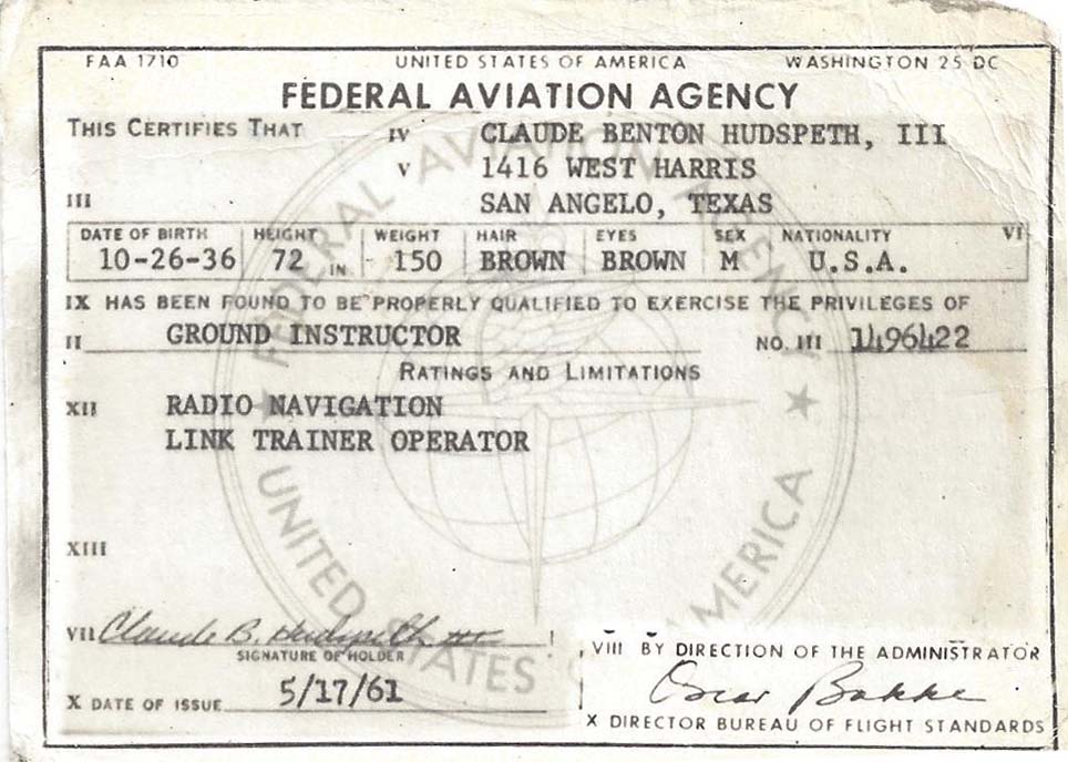 Once home, I enrolled at American Flyers, a commercial flying school, in Ft. Worth, and earned a commercial license and instrument rating, the very basic licenses required to be paid for flying airplanes. It took me about three years doing charter flights and flight instructing to reach 1200 hours. As this was in late 50s and early 60s when the airlines had many laid off pilots the result of the introduction of jet aircraft, pilot jobs were scarce. Nevertheless, I was always able to find a pilot job, but I couldn't compete with the more experience laid off pilots from the airlines for the better ones. In 1962 I was just basically a single engine pilot, though I had picked up a multi-engine rating, and a flight and instrument instructor's rating. Pilots with those qualifications were a dime a dozen.