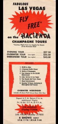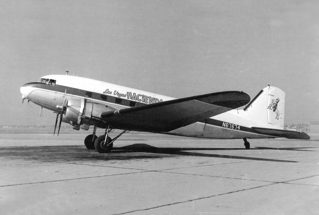 It worked. I went to California and landed a job with Las Vegas Hacienda Airlines as co-pilot on a DC-3 flying from San Diego to Las Vegas every evening and returning in the morning. The pay was $750.00 a month, the most money I had ever made. For $27.50 passengers got a deluxe room, a bottle of champagne, a free tote bag, $5.00 in chips plus air fare thrown in. I was fortunate the captain had been laid off from Flying Tigers Air Line, and he quickly made a professional pilot out of me. I also became very proficient in flying the DC-3. The job only lasted three months as the Civil Aeronautics Board shut the operation down because we were operating as a scheduled airline without a permit to do so. We were just carrying our hotel customers, but that didn't seem to matter to the CAB. Politics. 325 hours on DC3s.